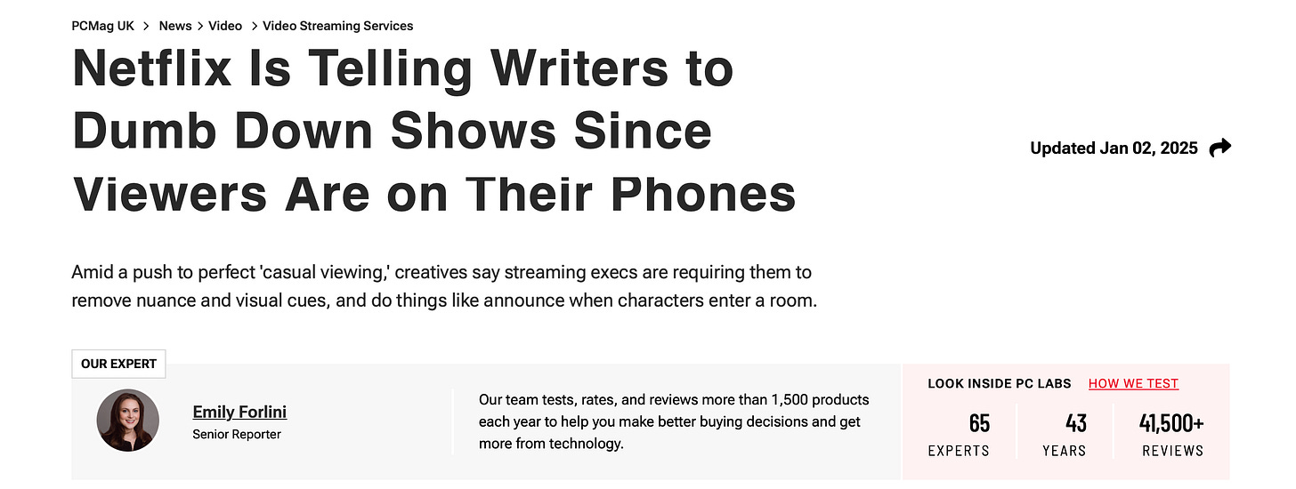 In some accounts, television programming has taken this new-found habit in mind. PC Mag reported early last year that executives at Netflix instructed writers to “dumb down” shows to accommodate viewers’ divided attention spans: announcing when characters enter the room, for instance, or dictating explicitly the narrative progress and direction.